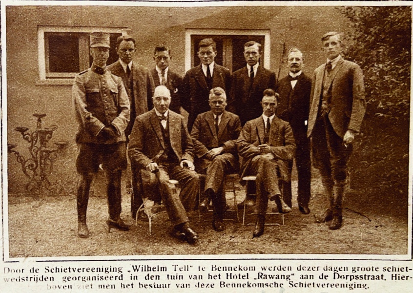 Afb. 5. 1965, Wilhelm Tell in zaal Bothof. V.l.n.r. Arie v.d. Brink, Job van Dusschoten (bakker), NN, Maas Roosenboom (meelfabriek), Willem Fluit (melkhandel, zaal Fluit, Zonnebloem en veel meer), Aart de Gooijer (boswachter Hoekelum), dhr. Rond en Dirk Zeilstra.