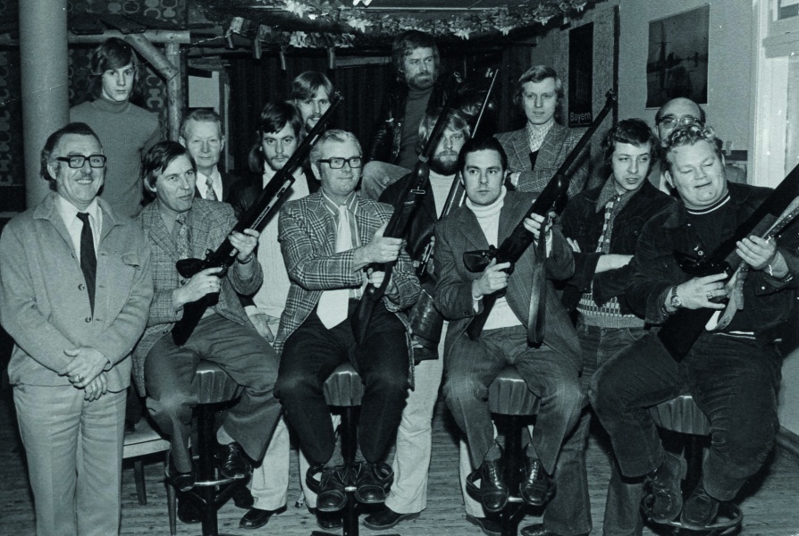 Afb. 6. 1970 in café Bothof. Vlnr Maas Roosenboom, ? de Bruin, Gert van den Berg (met geweer), Dirk van Holland, NN, NN (achteraan), Arris Dusschoten (met bril), Job van Butselaar (achteraan met baard), Hans Hoed (met baard en geweer), Geert Nab (vooraan met geweer), Martin Ruisch, Theo Peelen, Jan Kolkman (met bril), Jan Ruchtie
