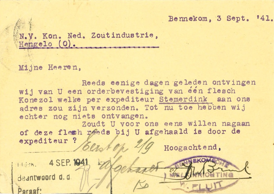 Fluit vraagt op 3 september 1941 of de “Flesch Konezol” al verzonden is enop 2 april 1942 meldt hij dat “een leege mandflesch” via de NS naar Hengelo verstuurd is en dat “ze gaarne een nieuwe flesch” willen ontvangen.