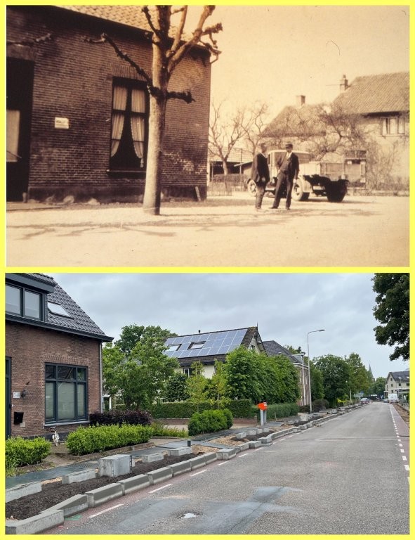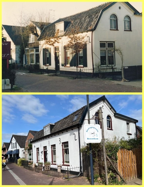 Dit pand is een van de oudste panden van ons dorp. Hier zat in mijn jeugd Alberts, de wagenmaker. Aan deze kant het woonhuis en aan de andere kant, aan de Bakkerstraat, de werkplaats. Waarom ik u het plaatje laat zien is niet de ouderdom van het pand, maar de bomen voor het pand. Op de bovenste foto staan er net nieuwe bomen, nu zijn we ruim dertig jaar verder en zijn de bomen onlangs weggehaald. Dertig jaar is niet veel voor een boom, maar de bomen waren in een dermate slechte staat dat ze weggehaald zijn voor dat een najaarsstorm dit op een onverwacht moment zou doen.