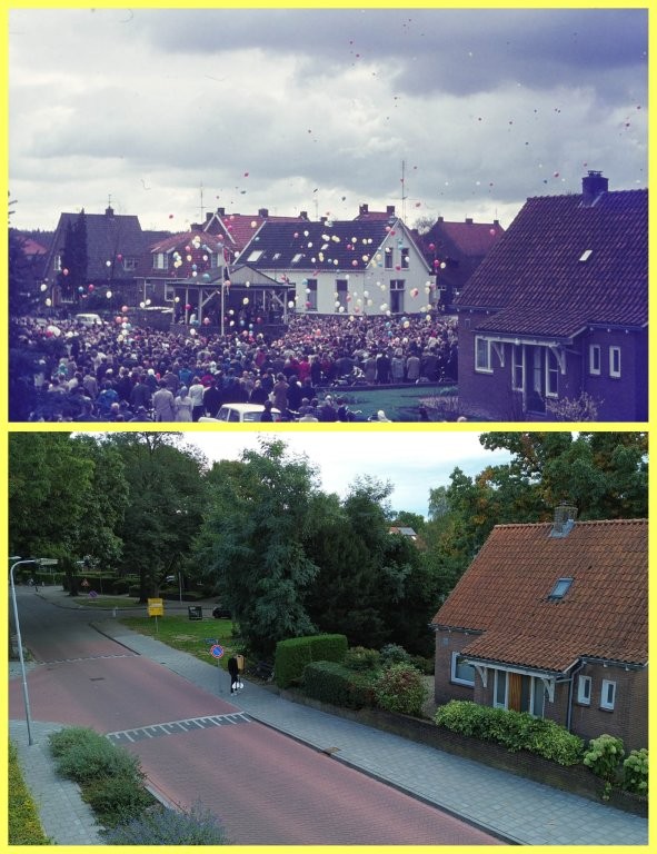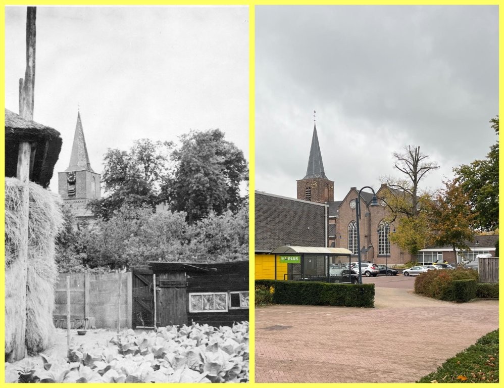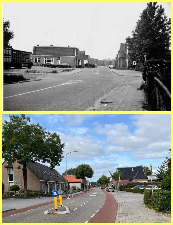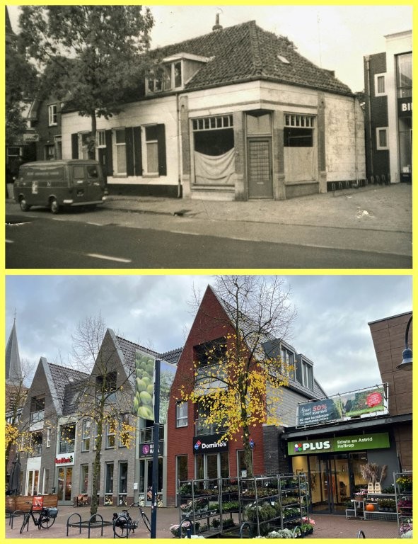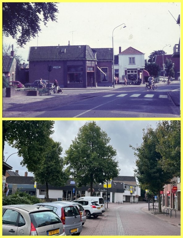 Het enige pand op de foto waar wat aan veranderde is het pand recht vooruit, aan de Dorpsstraat. Daar zat toen de groenteboer Van Silfhout. Nu zit daar Silhouet en kun je daar nu een klein hoekje onder het pand doorlopen. Er veranderde wel meer, maar daar staat nu een boom voor.