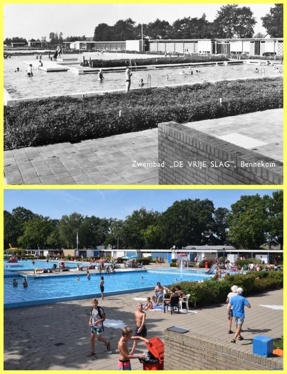 De bovenste foto is een ansichtkaart, gefotografeerd door de Bennekomse fotograaf Arie Nijhof. Die ansichtkaarten kon je destijds bij de kassa van het zwembad en bij de Bennekomse boekhandel kopen. Die kon je naar huis sturen als je in Bennekom bij familie logeerde of als je hier op vakantie was.