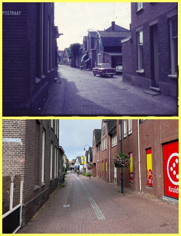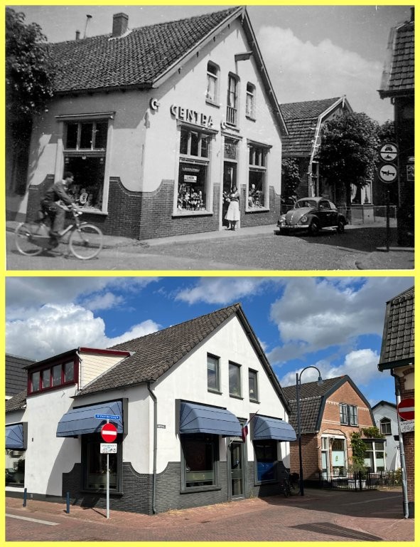 Dit deel van de Dorpsstraat is niet veel veranderd. De grootste verandering is wel de naamgeving van het gebouw rechts, dat was toen nog het Postkantoor. Een statig gebouw, ontworpen door G.J.M. Hof uit Nijmegen. Op de bovenste foto is het pand 45 jaar oud, dus nog redelijk nieuw. Nu bestaat het pand 115 jaar en is de naam veranderd in Het Oude Postkantoor.