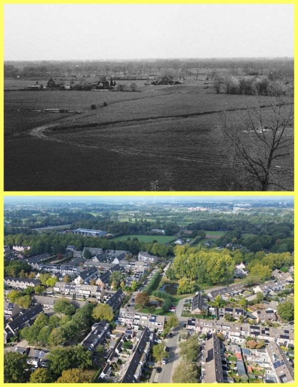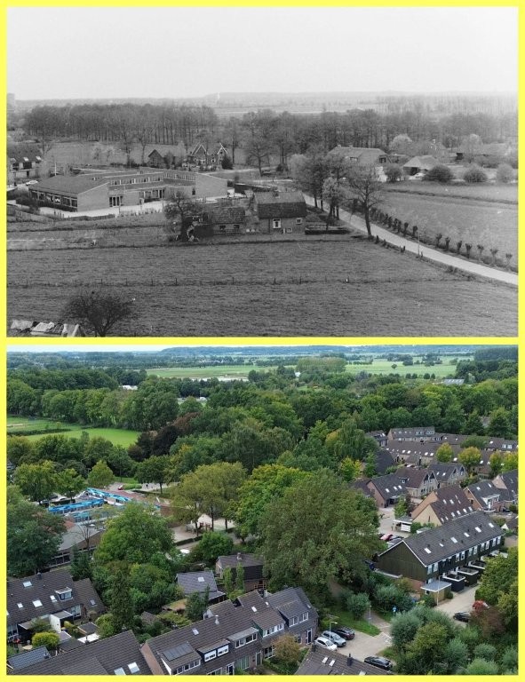 Als er in de afgelopen jaren iets ingrijpend veranderd is, dan is het wel op deze locatie. Op de bovenste foto is rechts de Maandereng nog volop in aanbouw. Naast de oksel van de oprit naar Utrecht was de crossbaan van de Edese Motorclub, daar is nu de bioscoop.