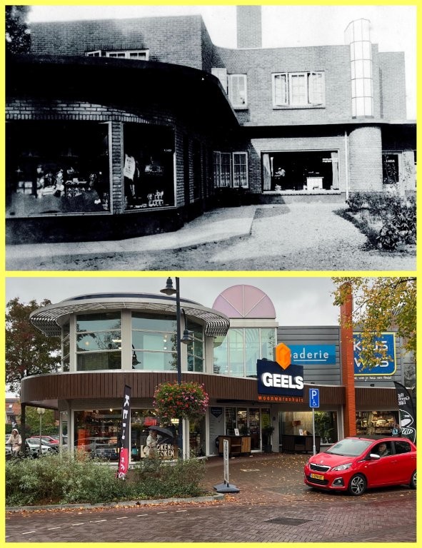 Dit bijzondere pand is ontworpen door de architect Van der Waal. Het architectenbureau ontwierp meerdere karakteristieke panden in en om Bennekom. Oorspronkelijk zaten er meerdere winkels in dit pand, in het midden Slagerij Ooijhuizen, later Van Ingen en rechts Gelria chemische wasserij en stomerij van de familie Keus. De firma Geels, met huishoudelijke artikelen en gereedschappen, zat toen alleen nog aan de linker kant. Toen de voorgenoemde winkeliers stopten met hun activiteiten kreeg Geels de mogelijkheid om de winkel en het assortiment uit te breiden.