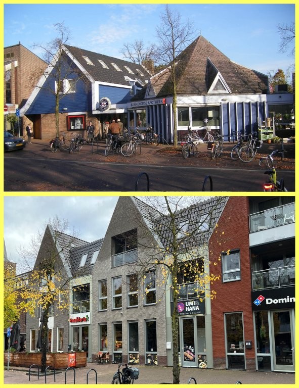 Op de oude foto staan nog de pastorie en de Bennekomse Apotheek. Op de achtergrond is nog de R.K kerk met toren en een klein stukje van het ooit zo mooie hotel Neder Veluwe te zien. Op de nieuwe foto is niets meer van het oude terug te vinden.