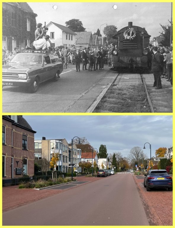 28 september 1968, op die dag was de laatste rit van de tram Bello door ons dorp. Het kwam zelfs in het landelijke nieuws. Hier staat links op de foto een reportagewagen van de NTS, de voorloper van de huidige NOS. Alhoewel, een reportagewagen is wel een beetje overdreven, de cameraman met camera en regisseur zaten op een imperial van een gewone personenauto.