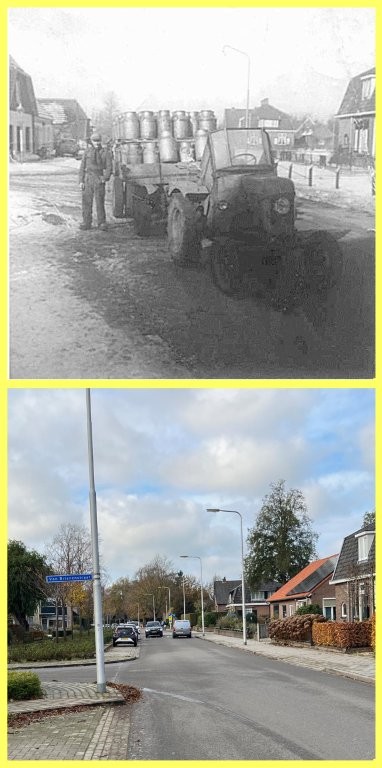 Op de oude foto staat de situatie ongeveer 45 jaar geleden. Je kijkt hier over de Bovenweg naar het dorp. Het kruispunt had toen nog verkeerslichten. Recht voor staat hier nog het kantoor van de NMB, de Nederlandse Middenstands Bank. Dat was in een tijd dat we wel vijf geldinstellingen hadden in ons dorp. De PIN kende we nog niet. Internet bestond voor de particulier niet, geen WIFI en geen mail. Aan de antennes op het dak te zien kwam de televisie nog door de lucht, dus via de ether het huis binnen.