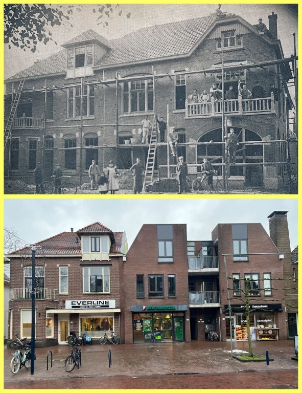 Het pand heeft de 2e wereldoorlog niet overleefd, net zoals het pand links ervan. De winkel ernaast staat er nu nog net zo, daar zitten slagerij De Haas en Bril 2000 in. Helemaal links zien we nog net een stukje van het enige vrijstaande woonhuis dat we nog aan de Dorpsstraat hebben.