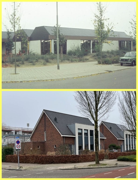 Links ervan was toen nog de bibliotheek, hier kort voor de verhuizing. Met de nieuwbouw, hier rechtsonder op de foto, op de hoek van de Kerkstraat en de Commandeursweg, is men net begonnen. Links van de bieb was het woonhuis, winkel en werkplaats van fietsenmaker Laurents, hier net afgebroken. De grond zou bij de uitbreiding van de Bennekomse Apotheek komen, op de bovenste foto het woonhuis. Links ervan stond de pastorie, waar de RABO Bank in gevestigd was.