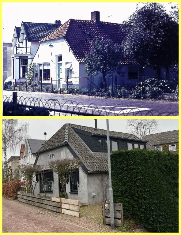 Dit huis is hagelnieuw en staat er op de nieuwe foto nog net zo, maar het is nu wel helemaal verscholen achter struiken. De oude houten schuur achter het huis is gesloopt, daar staat nu een nieuw woonhuis.