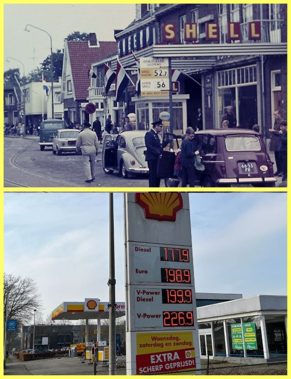 De bovenste foto is gemaakt in 1968, op de dag dat het trammetje Bello voor de laatste maal door ons dorp zou rijden. De superbenzine, vergelijkbaar met de huidige E10, kostte toen 56 cent. Toen hadden we nog de gulden. Ruim 2,2 gulden was de wisselkoers voor de euro, omgerekend kostte toen de benzine 24,5 eurocent. De huidige foto is van begin februari. Van de Weerd heeft nog steeds Shell brandstoffen, maar verkoopt ze nu aan de Kierkamperweg voor € 1,99 eurocent de liter. In 58 jaar is de benzine ruim 8x zo duur geworden.