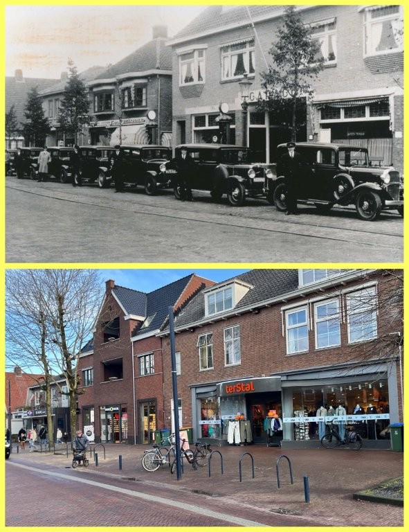 De foto is voor de oorlog genomen, het pand, en het pand links ervan zijn in de 2e wereldoorlog vanuit de Betuwe platgeschoten door de geallieerden. Het garagebedrijf werd gebruikt door de Duitse bezetter, vandaar dat het plat moest. Na de oorlog is het allemaal weer opgebouwd, de garage ongeveer in dezelfde stijl, maar de winkel links ervan werd helemaal anders. In de winkel links ervan kwam damesmodezaak Dokter, dat werd later de winkel van Woudstra en onlangs is het afgebroken en nu komt er iets heel nieuws.