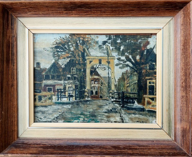 Kort daarna hebben we contact opgenomen met het Museum Arnhem, die een grote collectie van Dick Ket bezit. Volgens de conservator was er geen werk van Dick Ket bekend dat een voorstelling uit Delft zat. We zijn verder gaan zoeken en ontdekten dat de familie Ket van 1920 tot 1922 in Hoorn heeft gewoond, waar ook de nodige ophaalbruggen zijn. We namen contact op met de Vereniging Oud Hoorn en stelden de vraag of de afbeelding op het schilderij te linken was aan een locatie in Hoorn. Ondertussen zochten we in hun uitgebreide beeldbank naar foto’s van ophaalbruggen. Er zowaar vonden we een foto die wel verdacht veel leek op het schilderijtje van Dick Ket. De oude foto was gemaakt in die tijd en het had er alle schijn van dat dit dé brug was. Twee dagen later bevestigde ‘Oud Hoorn’ de locatie en gaf bijzonderheden over wat er is afgebeeld. Het betreft de Kleine Oostbrug. Deze houten brug is in 1925 vervangen door de huidige metalen ophaalbrug. Hierdoor is het schilderijtje nog beter te dateren.