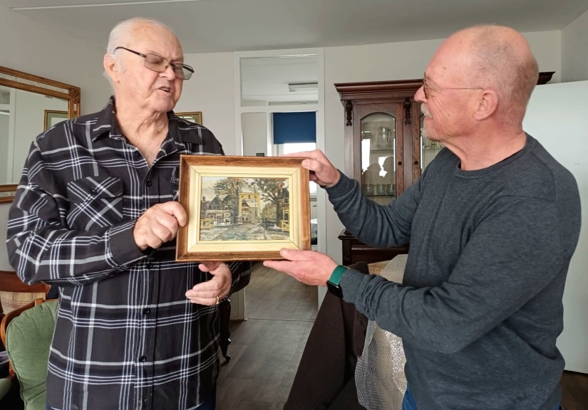Wij zijn kort daarna naar Vlissingen getogen en hebben het schilderijtje in ontvangst genomen van de gulle gever. Zelf hadden we voor hem wat boeken en een mandje met wat Bennekomse streekproducten meegenomen.
