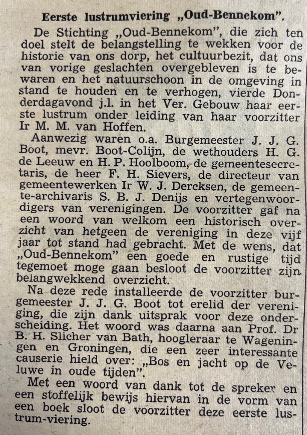 Het was ook de avond dat Oud-Bennekom haar eerste erelid benoemde; burgemeester van de gemeente Ede J.J.G. Boot. De heer Boot vetrok op 1 oktober 1951 naar Hilversum waar hij benoemd was als burgemeester.