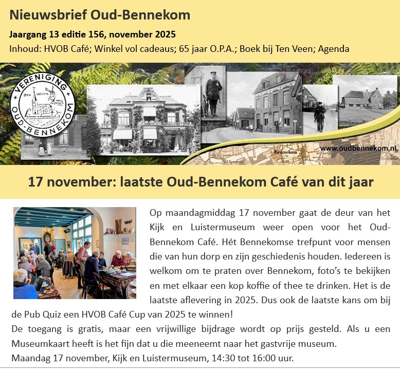 Ontvangt u de nieuwsbrief nog niet en wilt u goed op de hoogte blijven van alles wat er bij Oud-Bennekom gebeurt en te doen is kunt u zich aanmelden via nieuwsbrief@oudbennekom.nl voor onze gratis digitale nieuwsbrief, die circa twaalf keer per jaar verschijnt.