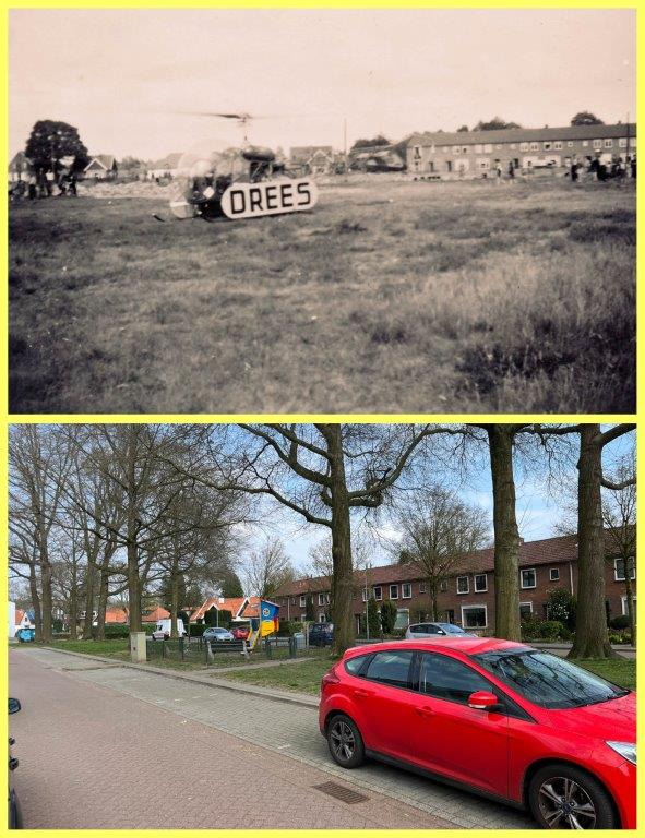 We zien een helikopter die geland is op een kaal stuk grond bij de Laarweg. Nu is daar een groenstrook met een kinderspeelplaatsje. Op de nieuwe foto kun je links nog net de Ichthuskerk zien. Of minister Drees echt in deze helikopter zat, en waarom hij naar ons mooie Bennekom kwam is niet bekend. Kwam hij om de bewoners van deze nieuwe woningen, die van Plicht Getrouw waren, de sleutel te overhandigen?