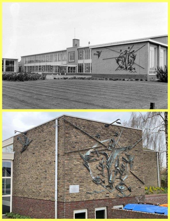 Ongeveer een jaar later is het kunstwerk uit de kast gehaald en op de achtergevel van De Brink aan de Krulweg gemonteerd. Het paste bijna precies. Alleen de vogel helemaal links op de bovenste foto heeft een plaatsje om de hoek gekregen.