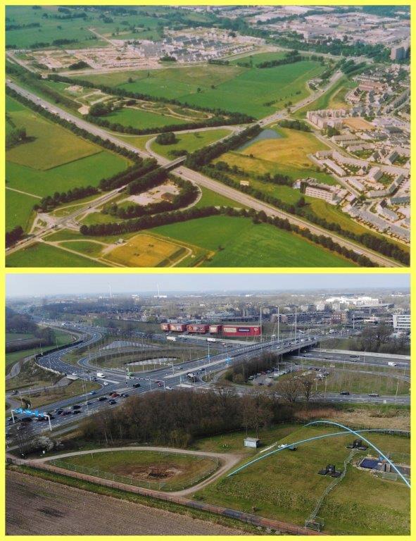 Als er in de afgelopen jaren iets ingrijpend veranderd is, dan is het wel op deze locatie. Op de bovenste foto is rechts de Maandereng nog volop in aanbouw. Naast de oksel van de oprit naar Utrecht was de crossbaan van de Edese Motorclub, daar is nu de bioscoop.