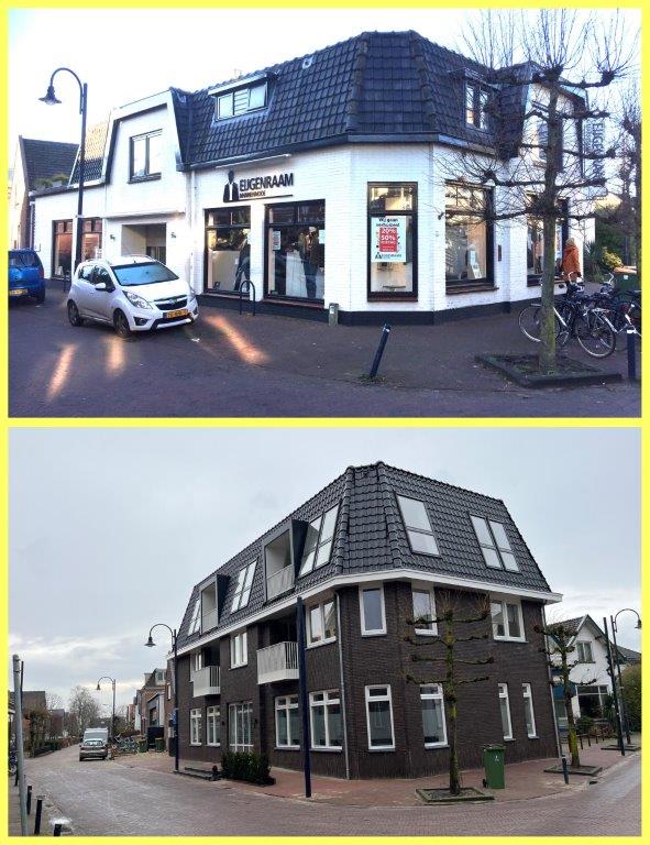 Er hebben nogal wat winkels ingezeten, de laatste was Eygenraam met een mannenmodewinkel. Daarna heeft het een tijdje leeggestaan en toen ineens werd het in korte tijd gesloopt om plaats te maken voor iets heel nieuws. Beneden is nu de praktijkruimte van tandarts Spreij en Van der Goes, erboven zijn nu vier appartementen. Het pand is qua oppervlakte gelijk gebleven alleen kwam er een hele verdieping, voor de appartementen, bovenop.