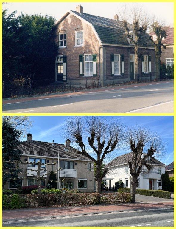 Dit pand is een van de oudste panden van ons dorp. Hier zat in mijn jeugd Alberts, de wagenmaker. Aan deze kant het woonhuis en aan de andere kant, aan de Bakkerstraat, de werkplaats. Waarom ik u het plaatje laat zien is niet de ouderdom van het pand, maar de bomen voor het pand. Op de bovenste foto staan er net nieuwe bomen, nu zijn we ruim dertig jaar verder en zijn de bomen onlangs weggehaald. Dertig jaar is niet veel voor een boom, maar de bomen waren in een dermate slechte staat dat ze weggehaald zijn voor dat een najaarsstorm dit op een onverwacht moment zou doen.