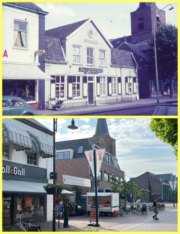 Het enige pand op de foto waar wat aan veranderde is het pand recht vooruit, aan de Dorpsstraat. Daar zat toen de groenteboer Van Silfhout. Nu zit daar Silhouet en kun je daar nu een klein hoekje onder het pand doorlopen. Er veranderde wel meer, maar daar staat nu een boom voor.