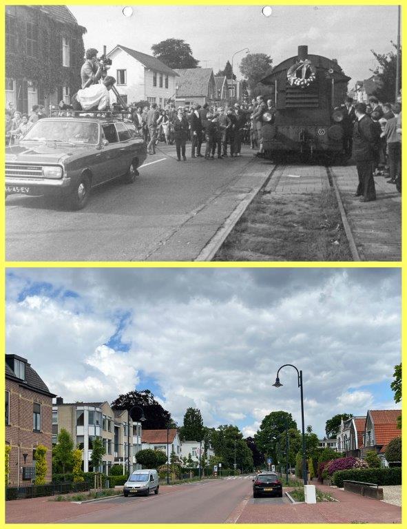 De bovenste foto is genomen op 28 september 1968 op de Edeseweg. Op die dag reed voor de laatste keer de trein Bello door ons dorp. Nu kun je het bijna niet indenken, maar tot die tijd reed er vrijwel elke werkdag een treintje dwars door ons dorp. Daar kwam op die dag een einde aan en dit gebeuren haalde het landelijke nieuws. Hier op de foto zien we een camerawagen van de toenmalige N.T.S. (nu de NOS) die opnames maakte en op de televisie uitzond.